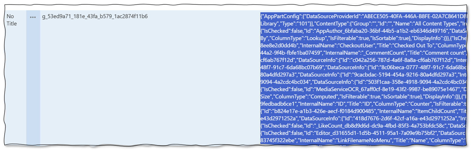 If your LC has only one view, you'll find its configuration in the ConfigConfigDataField column. If it has multiple views, you'll find it in the ConfigViewsConfigDataField column. In either case, the configuration content is simply JSON code. Select all of the contents of one configuration (triple-click within the code area), copy/paste it into a text editor (e.g. NotePad), and then save it as a file (with any meaningful name) with a .data file extension.